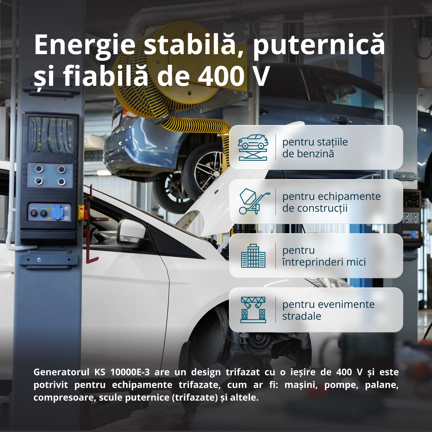 - Cadrul robust din oțel protejează generatorul împotriva diverselor tipuri de deteriorări.